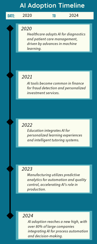 AI Adoption Timeline: A visual overview of how artificial intelligence has evolved across industries from 2020 to 2024, highlighting key milestones in healthcare, finance, education, and manufacturing.