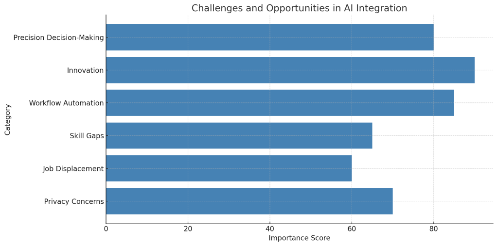 Challenges and Opportunities in AI Integration: While AI brings innovation and workflow automation, it also poses challenges such as privacy concerns, job displacement, and skill gaps that organizations must address. Opening Up The Workplace: The Way AI Tools Are Changing Productivity