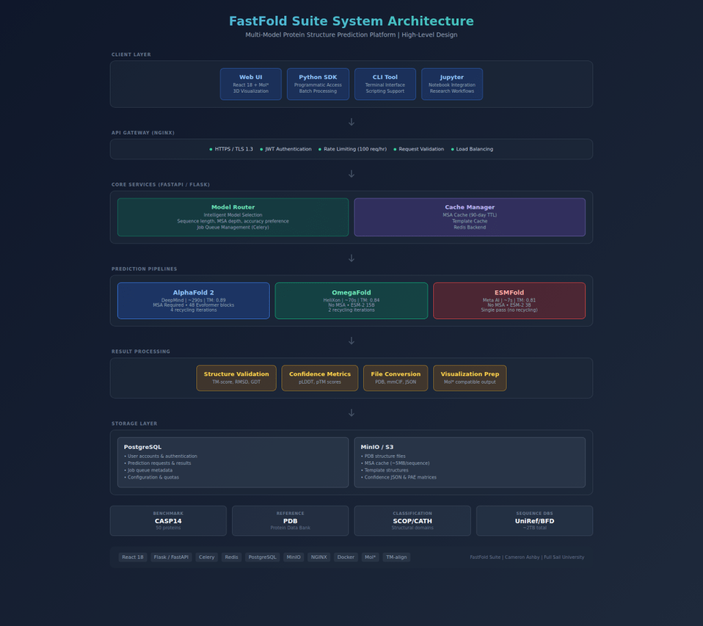 This blog series documents the development of FastFold Suite, my capstone project. FastFold is a web-based platform that integrates multiple AI models for protein structure prediction, specifically ESMFold, OmegaFold, and AlphaFold 2. The goal is to make these powerful tools accessible to researchers who lack the infrastructure or technical background to run them independently.