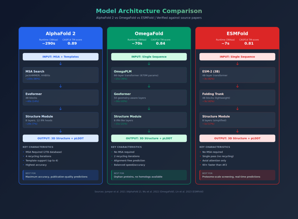 - References: Jumper et al. 2021 (AlphaFold), Lin et al. 2023 (ESMFold), Wu et al. 2022 (OmegaFold)
